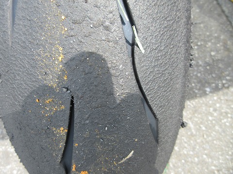 10:32 フロントは こっちはフロント側。 こっちも端まできれい。 フロントは、前回の走行よりもエアー圧を下げて、剛性感は減りましたが、まだPIRELLIよりもしっかり感はあります。 いずれにしても、この暑さの中、自分のレベルだとタイヤが垂れることもなく、無事に走り終わりました。 BSのR11の場合、フロントに荷重を載せてやると旋回性が上がるので、上手く特性を引き出す乗り方にしないとです。 タイヤの観察が終わったら、残ガス(ガソリンの残り)を計って、タイムを記録したら、片付けます。 |
