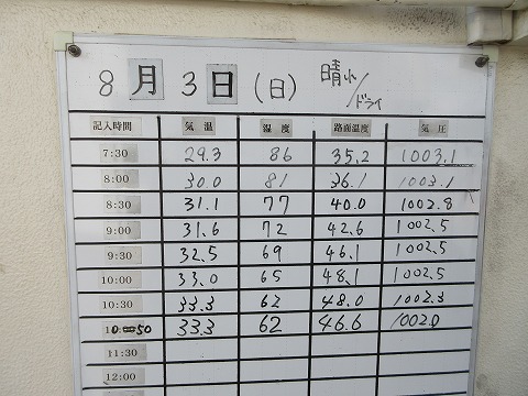 9:34 2本目のコンディションは 流石に暑くなってきたので、2本目の走行前にコンディション ボードを確認。 9時半の時点で、気温32.5℃、路面温度 46.1℃。 46.1℃かぁ〜。 流石に、タイヤが垂れてくる温度ですね。 気を付けて、走らないとね。 |
