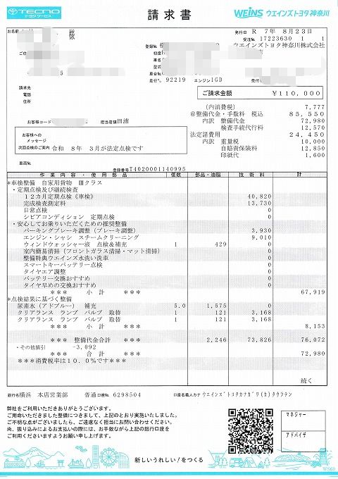 車検内容は 車検が終わって、引取りにきました。 車検費用は 11万円。 点検内容は、(ディーラーお薦めの)標準的な車検整備。 毎年車検の時にやっているオイル&フィルター交換はしませんでした。 オイル交換は、5月に89,869kmでやって、まだ2,000kmちょっとしか走って無いので。 それに、オイルフィルターは前回の車検のときに交換していて、 これも、 92,219 − 85,323 = 6,896 km しか走ってないので、これも不要と言うことで。 あとはウォッシャー液を補充とアドブルーを補充。 あと、ヘッドライトのポジションランプが切れていたそうで、電球を交換しました。 ヘッドライトのポジションランプなんて、自分だとなかなか気付かないですね。 以上で、今年の車検は終了です。 (おわり) |