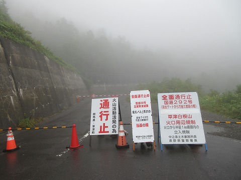 14:58 通行止め中 万座温自然情報館で休憩した後、県道464号牧干俣線(まき ほしまた せん)に入り北上し、国道299号線とのT字路までやってきました。 ここを右折すると草津白根山方面ですが、さっきも書いたように”通行止め”。 湯田中温泉は左折なので、影響ありませんが・・・・。 逆に、草津温泉方面から流入するクルマが居ないので、国道299号線は空いています。 とは言っても、写真にあるように辺りは雲の中。 この辺りの標高は2,000mに近い1,970mあるので、万座温泉から標高を上げるにつれガスっちゃいました。 |