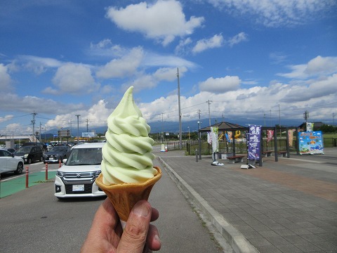 12:04 爽やかにライトグリーン 今日は昨日と打って変わって好天。 この時期じゃまだ暑いです。 と言うことで、浅間山をバックにクールダウンのソフトクリーム。 長野県産のシャインマスカットを使った爽やかなライトグリーン。 冷たくて美味しい。 |
