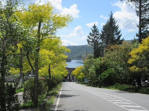 13:12 白樺湖に 蓼科牧場の交差点まで進むと立科スカイラインは終点です。 その後、長野県道40号諏訪白樺湖小諸線に入り西走すると目の前に白樺湖が見えてきました。 白樺湖の標高は1,400mほどあり涼しいこともあり、周囲には葉が黄色く色付いてきている木々もあります。 |