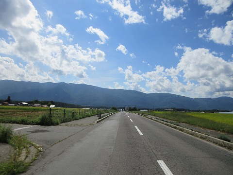 11:45 千曲ビューラインを 東御市の県道94号線を南下し、国道18号線を横断。 千曲川を渡ったのち、左岸側を走る千曲ビューラインに入り佐久方面を目指し東進します。 左手前方は浅間山ですが、上の方は雲に覆われて見えませんね。 |