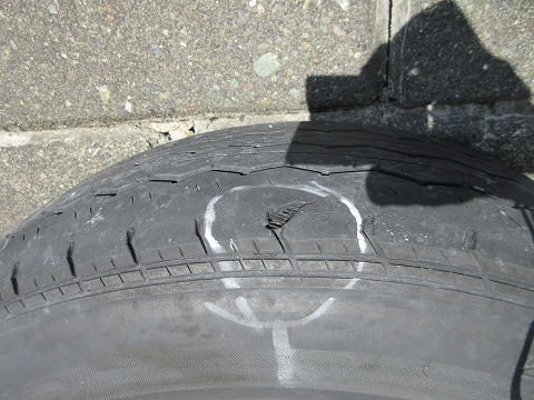 9:43 フロントだけスタッドレスに 走った感じだと、たぶん左のフロントタイヤが怪しそう。 エンジン回転数に比例することはなくて、速度(タイヤの回転数)に比例するような振動でした。 9月27日(土)筑波に行った翌日の28日(日)にタイヤをチェック たぶんこれが原因と思われる事象を見つけました。 そのため、不具合を確認するため28日(日)にスタッドレスタイヤを引っ張り出してきて、フロントタイヤだけ交換して走ってみました。 結果、大丈夫。 ハンドルの振動は出ませんでした。 |
