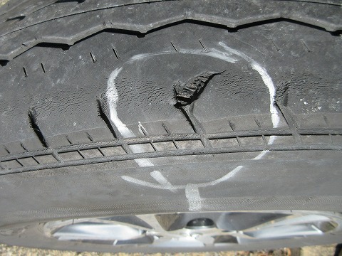 9:47 トレッドが たぶん振動元であろうフロントの左側は外す前にジャッキアップ。 手で回転させてみると、サイドウォールに凸がある個所が・・・・。 凸のある箇所のトレッド面を見たら、トレッドが剥がれてるじゃん! こんなの初めてだぜ。 |
