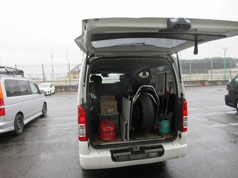 9:11 載せました ハイエースにCBRを積みこみました。 結局、雨止ませんでした。 こんなことも年に1回2回はありますよ。 |