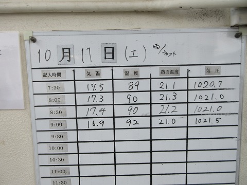 9:13 今日のコンディションは 腕章を返却したら、コースインゲート脇のコンディションボードを一応確認。 走ってないけどね。 8時〜9時で気温が17.3℃〜16.9℃ 路面温度が21.3℃〜21.0℃ 雨が降っていなかったら、良いコンディションでしたね。 残念。 今日は少しでも走っておきたかったんですよね。 と言うのも、来週エビスサーキットの走行会があるんで、R11の感触を少しでもつかんでおきたかったんです。 でも、結局来週のエビスサーキットの走行会も雨。 最初から100%雨確定だったこともあって、遠いので行きませんでした。 |