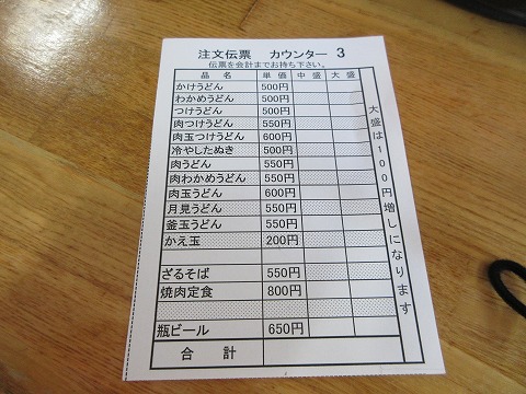 11:11 注文は 店に入るとカウンターの席が2つ3つ空いていて、待たずして運よく座れました。 流石にテレビの放送から5年も経っているので、以前のような混み方はしないのかな。 さて、注文。 番組で取り上げられたのは注文伝票の下の方にある”焼肉定食”。 うどん屋さんなのにね。(笑) 放送終了以降、お客さんの7~8割りは、この”焼肉定食”を注文している感じ。 以前は2割りくらいだった様な感じだと記憶していましたがね。 自分は今まで食べたことがありません。 まあ、1回くらい頼んでみないとね。 注文は”焼肉定食”の普通盛りで。 注文伝票に記入して、カウンター越しにお店の人に渡しました。 |