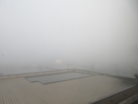 部屋に戻り、窓から外を眺めると、すごい霧です。