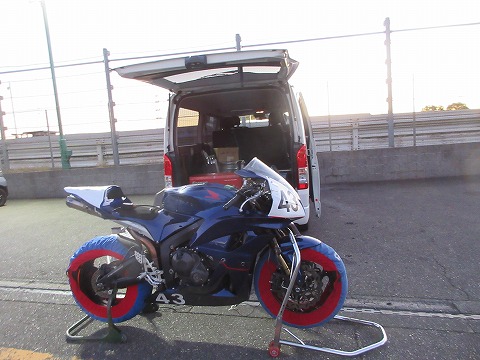 6:18 タイヤを温める 10分も経つとすっかり日が昇って、明るくなりました。と思ったけどそうでもないかな。 カメラが勝手に明るく写っているだけで、CBRには近くの電灯の光の影がしっかりありますもんね。(どうでもいいけど) 11月末になって気温が低くなってきたので、タイヤウォーマーをいの一番に取付けて、しっかりタイヤを温めます。 けど、タイヤウォーマーのブランケットを巻くのは止めておきました。 (理由はね、自分への備忘録として書いておくけど、タイヤを温め過ぎないように。 寒くなると、コースインして最初の2〜3周はタイヤウォーマーで温めてあるのである程度グリップするそうです。 そして3周目を過ぎたころから、路面が冷えているので、タイヤを温める走りが出来ないとタイヤも冷えてスリップダウンをする人が出てくるそうです。 ので、自分の無い頭で考えて、タイヤの温度が急激に下がり過ぎないように、ほどほどに温めてみることにしてみました) |
