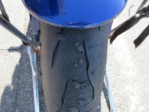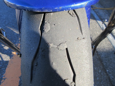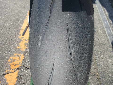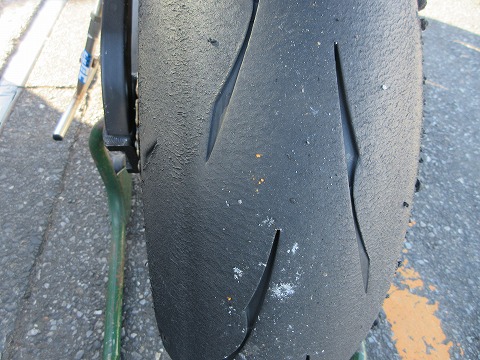 8:32 走行後のリヤタイヤ 1本目の走行が終わってパドックに戻ってきました。 タイヤの表面チェック。 リヤタイヤ側、一番端っこは使ってませんね。 路面温度が低いので、寝かせすぎは禁物なので、これはこれで良いかと。 アクセルを開けていく所は、タイヤ表面がザクザクに荒れたところもなくて・・・。 でも、もう少し(アクセルを)開けても良さそうな感じ。 次の走行は、バイクを起こしてよりアクセル開けて加速重視で走る様に心がけよう。 |