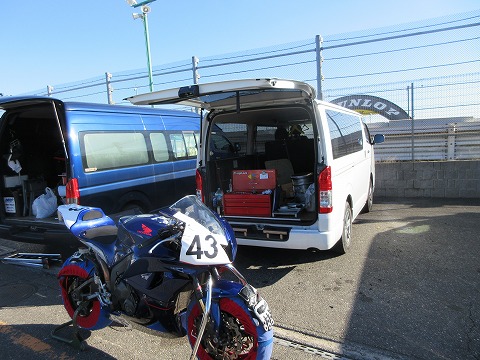 7:43 走行15分前 ぼちぼち総億15分前になるので、ライディング ウェアに着替えます。 自分的には、走行何分前に何をやるか、大体決めてあります。 毎回、何をやるか考えたくないんでね。 それよりも、今日走るのに何をするかを考えるのを優先したいので・・・。 で、今日の走りの課題は・・・・・。 「今シーズン履き始めたBSのR11の寒さに慣れる」 です。 |