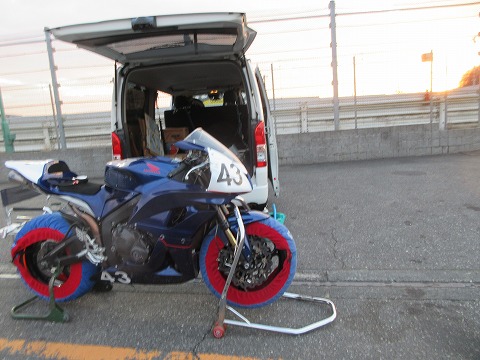 7:00 タイヤを温める 設営場所が決まったら一番にタイヤ。 寒くなって、タイヤが温まり難くなるので、少しでも長い時間ウォーマーを巻きたいところです。 ハイエースからCBR600RRを下ろしたら、冷間でタイヤのエアー圧を確認して、タイヤウォーマーを巻いて、タイヤの温め開始です。 ちょうど7時。 今日1本目は9時からなので2時間きっちり温められます。 |