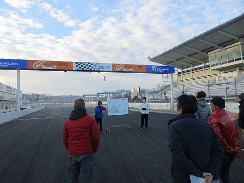 8:11 ライダースブリーフィングに向かう ガソリンを買ってきたら、ライダースブリーフィングに参加します。 この時間、ホームストレートは日陰です。 寒いです。 |