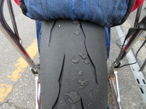 9:42 走行後のリヤタイヤ 1本目の走行が終わってパドックに戻ってきました。 いつものタイヤの表面チェック。 リヤタイヤ側、一番端っこは使ってませんね。 右側の端っこにはタイヤカスが残っています。 左側は、タイヤカスが出るほどもペースが上がってないんだね。 ダメじゃん。 立ち上がりでアクセルを開けていく、右側中間部分の溝が薄くなってきてますね。 タイヤが終わりが近いです。 前使ってたPIRELLIは溝が無くなってもグリップしてたけど、BSのR11はどうなんでしょうね。 ただ、溝が無くなると、見ているだけど精神衛生上よくないです。(笑) |