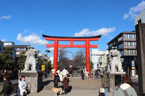 14:00 小町通りは 駅のロータリーに接続している小町通りの入口にある鳥居。 鶴岡八幡宮に向かう商店街。 お土産屋さんと飲食店が並びます。 決して、地元民向けの八百屋とか肉屋とかスーパーとかがあるわけじゃありません。 小町通りは混むので帰りに通るとして、参道の若宮大路を通って鶴岡八幡宮に向かうことにします。 |