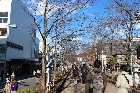 14:01 若宮大路へ JR鎌倉駅から真っすぐ進むと50m程で若宮大路のある神奈川県道21号横浜鎌倉線に出ます。 県道21号線は八幡宮とは反対に1.3kmほど南下すると、由比ガ浜で国道134号線に突き当ります。 普段は、若宮大路の両側をクルマが走っていますが、正月の三が日は一般車進入禁止で、半分歩行者天国ぽくなっています。 ただし、域内に居住している住民のクルマは走れるみたいです。 けど、この状況じゃよっぽど用事がない限りクルマ出そうとは思わないでしょうね。(笑) |