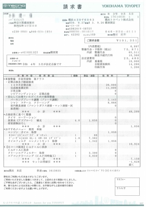 9月でハイエースは3年目。 2回目の車検を通しました。 備忘録です。 |