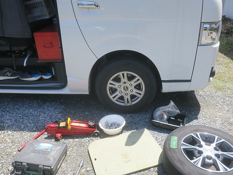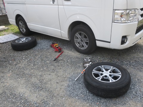 夏タイヤに交換 | ゴールデンウィークも本番に突入した5月3日、遅ればせながらハイエースのタイヤをスタッドレスから夏タイヤに入れ替えます。 夏タイヤが今年で7シーズン目、スタッドレスタイヤは6シーズン目で、どうしても冬場の方が走行距離が少ないので、スタッドレスは溝が残っていて、夏タイヤは寿命が終わりそうです。 そんな訳で、なるべくスタッドレスタイヤを長い期間履いて、履き潰しちゃおう。と思っているので、交換時期はこんな時期になっちゃいました。 |