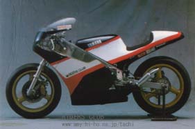 見本。(笑) 当時、雑誌ライダース クラブに掲載されていた トガシ エンジニアリング製のアルミ フレームに変更した純レーサーのTZ250。 当時はまだ市販のTZは、鉄のパイプ フレームだった。 しかも、スポーク ホイール。 この写真を見て、「格好いい〜。」と思い、このイメージでカラーリングすることに。 |