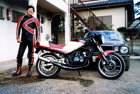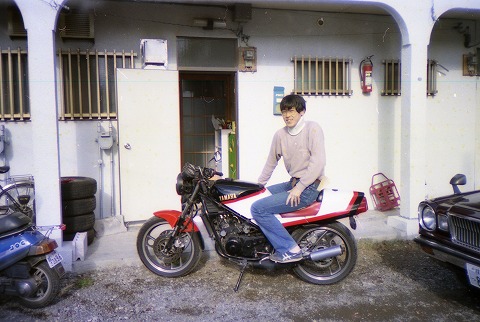 「わっ、若い! (爆)」 (時間というものは、残酷なものだ。) 塗ったよ。 自分で、缶スプレーで。 しかも、下宿の自分の部屋にタンクとかサイドカバーとかテールカウルを持ち込んで。 結構、上手く塗れました。 流石、暇のある学生。 じゃなくて、真実は普通の人が4年で学ぶところを、5年かけてるからね。 革つなぎは、大学の友人から売ってもらった中古品。 クシタニのKマーク。(懐かしい) 当時は、吊し(既製品)のつなぎが着られたんだよなぁ〜。 ちなみに、ブーツは”プロショップ タカイ”製です。 |