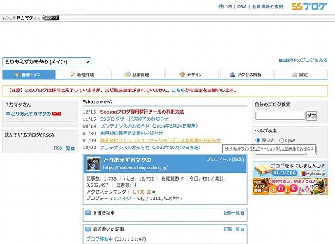 このホームページと並行してネットに上げているブログですが、昨年の11月にブログ会社のSSブログから2025年3月いっぱいで、ブログを休止するお知らせがありました。 それと並行して、ブログの移行先としてseesaaブログの推奨(?)がありました。 2024年の記事をひと通りアップし終え、2025年の記事に変わるタイミングでSSブログからseesaaブログに移行することにしました。 seesaaブログにはssブログにあった”いいね”ボタンが無いのでどうしようかと・・・・。 とりあえず、x(旧twiter)のリンクを貼っておいて、そっちに”いいね”してもらおうかと考えています。 しばらく、試行錯誤してみます。 |